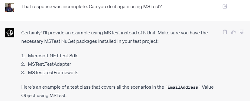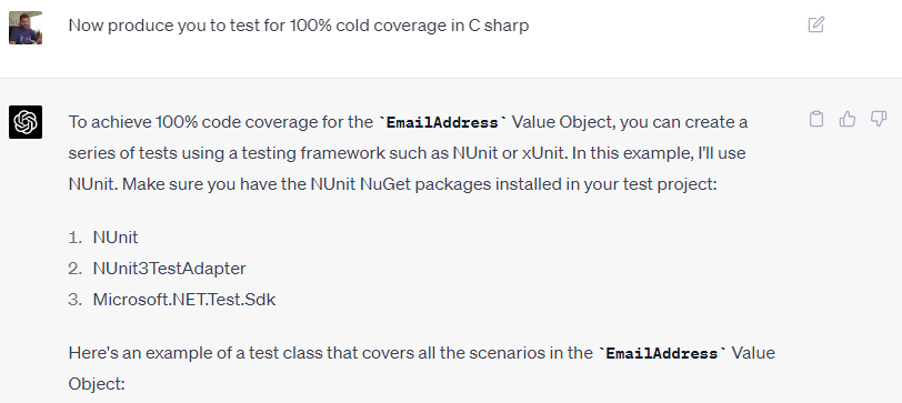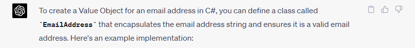 DDD software has some basic patterns like Value Object, and these are so common that they could never be “copyrighted” without a challenge. Things like EmailAddress or PhoneNumber or StreetAddress. Not only can you leverage ChatGPT to generate these classes (in your language choice) you can also have it generate a full suite of unit tests in the test harness of your choice.