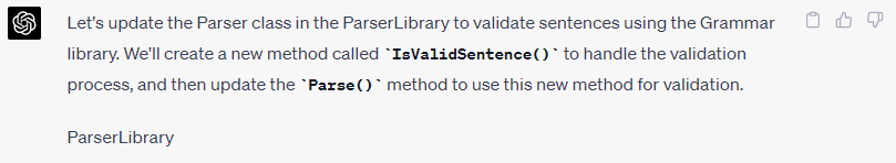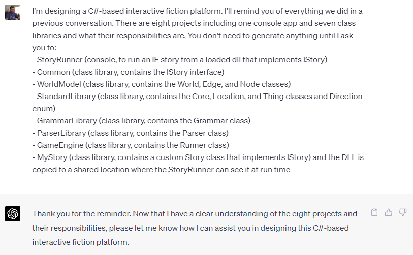 I’ll pause here to talk about what it’s like working with ChatGPT on a project like this. First of all, you absolutely need to understand the domain. Although ChatGPT understands elements of IF, it only understands what’s existed within the Internet when it was loading its AI. It knows about existing platforms like TADS and Inform and probably a lot of free form text on the subject. It won’t have any idea on new concepts like building the world model on an in-memory graph or on having a separate Text Service to combine and emit text. Those are my own thoughts and I needed to spell out their design to ChatGPT.